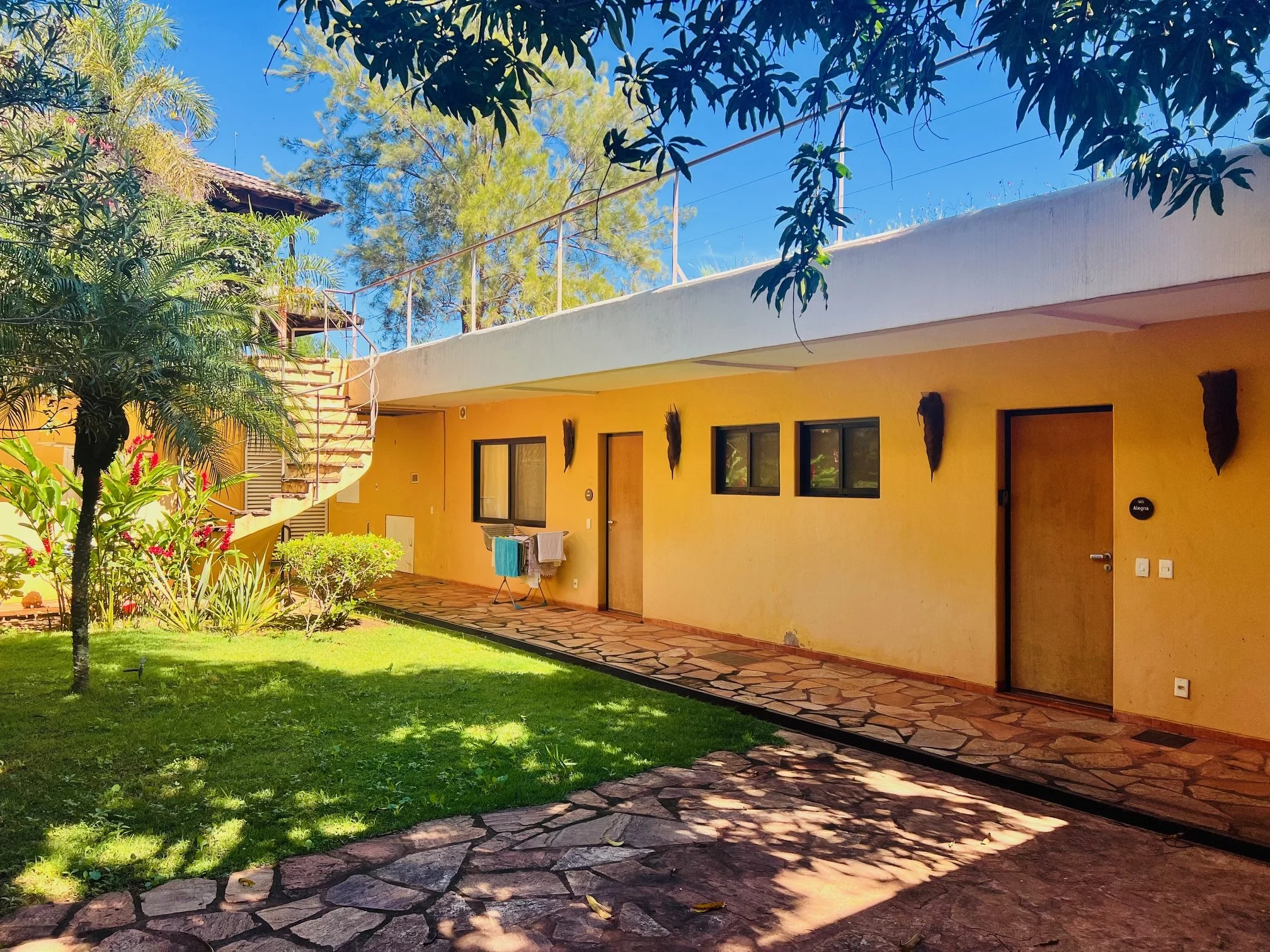 Alegria (right) and Amor apartment entries; the staircase leads to the grass-covered roof over both apartments. The private laundry area for these two apartments is left of the staircase in the rear.